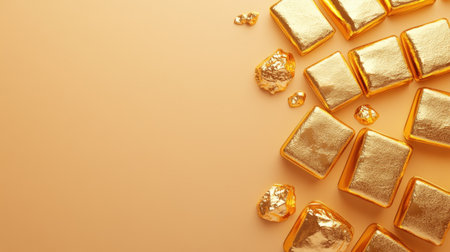 A captivating image of shiny gold bars and nuggets arranged on a smooth orange background. Perfect for conveying themes of wealth, luxury, and prosperity.
