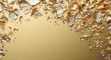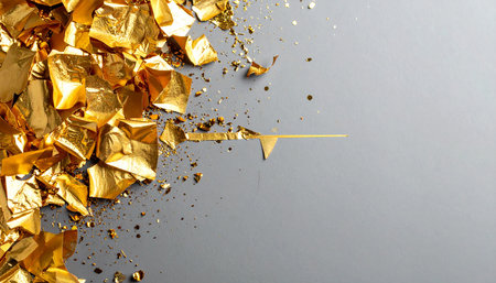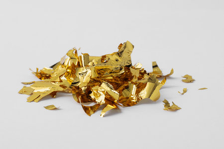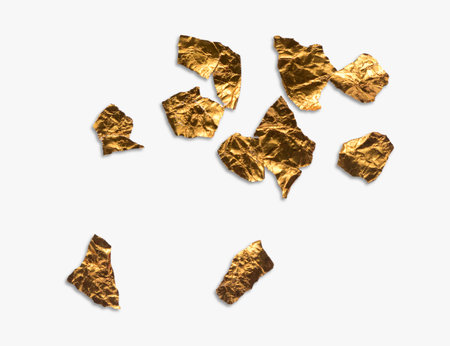 A visually appealing arrangement of scattered golden fragments on a smooth surface, perfect for use in luxury design projects or creative artwork.