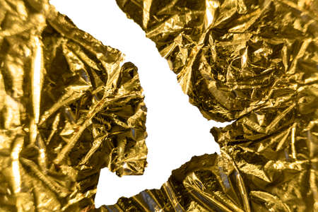 Golden crumpled foil texture isolated on white background