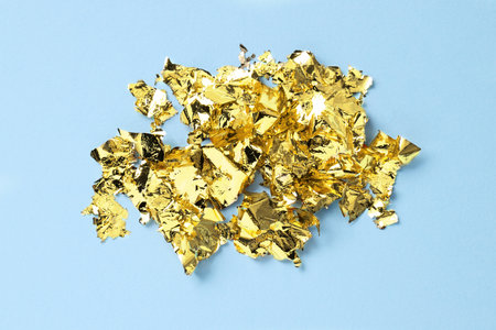 Many pieces of edible gold leaf on light blue background, top view
