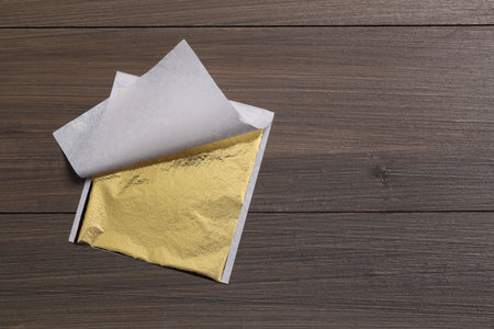 Edible gold leaf sheet on wooden table, top view. Space for text
