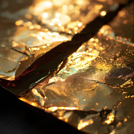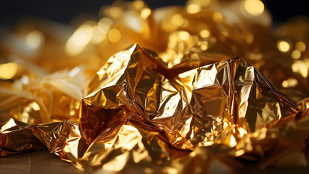 Shiny gold foil on a dark background. Shallow depth of field.