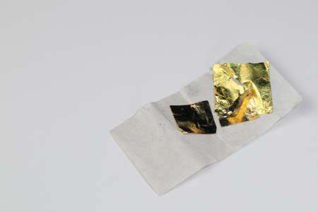 Gold foil leaf shiny on wrapping paper, piece of Gold leaf on paper isolated on white background.
