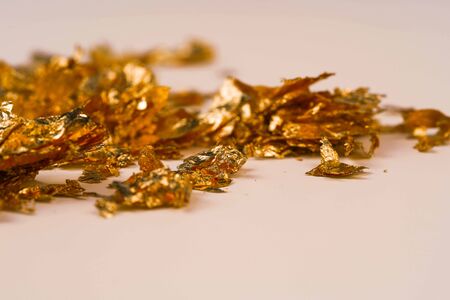 Pile of edible gold leaf on white background