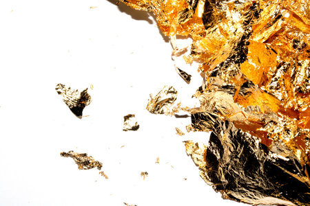 Vibrant Gold Leaf Pieces Close Up on A White Background as Decorative Pieces