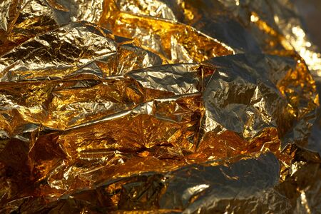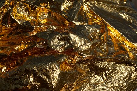 Gold background. Texture of crumpled yellow or gold metallic color with harsh light. Foil with creases close-up.