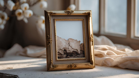 Vintage elegance captured in a detailed photo frame on an antique side table, oozing old-world charm and sophistication. Generative AI