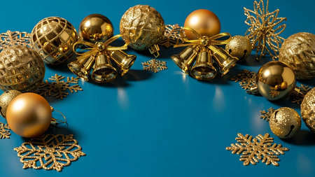presents a close-up view of several gold Christmas baubles, showcasing both smooth and glitter-covered surfaces, arranged on a deep blue background. The baubles are positioned in a way that highlights their spherical shapes and reflective qualities. In the background, soft, out-of-focus golden lights create a bokeh effect, adding a magical and festive ambiance to the scene, holiday themes.