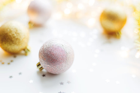 Christmas holidays composition with gold decorations on white background with copy space for your text