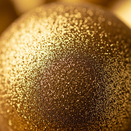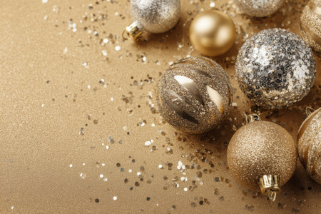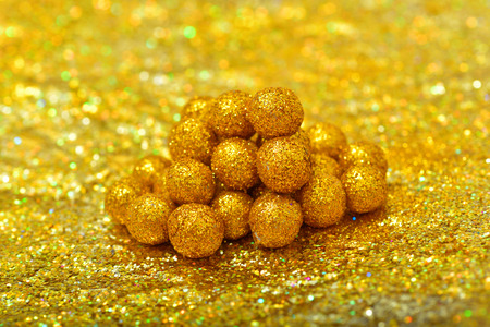 A festive arrangement of gold Christmas ornaments nestled on a bed of shimmering gold glitter, creating a warm and celebratory atmosphere.
