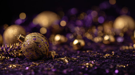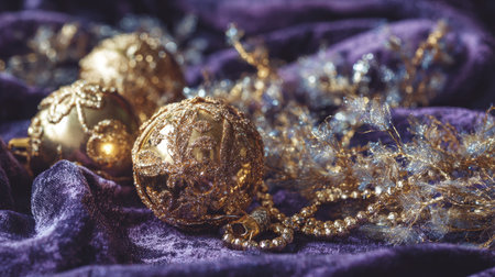 Closeup of luxurious golden decorations resting on a soft purple surface, creating a rich and festive atmosphere perfect for holiday celebrations.