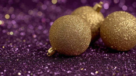 Beautiful gold Christmas ornaments catch the light against a shimmering purple background, creating a festive atmosphere perfect for holiday celebrations.