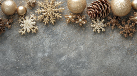 A stunning arrangement of golden Christmas decorations on a dark stone surface. Features ornaments, pinecones, and snowflakes, perfect for holiday themes or events.