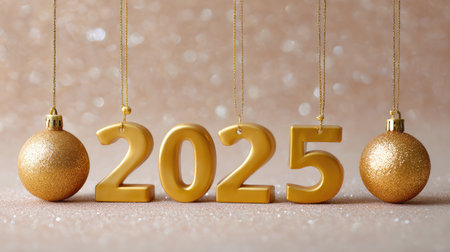 Celebrate the arrival of 2025 with this vibrant and festive composition featuring golden numbers and ornaments against a sparkling backdrop.