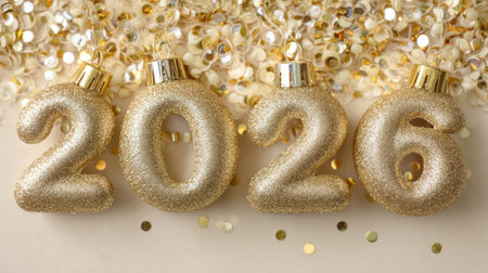 Decorative gold glitter numbers 2026 shine brightly surrounded by sparkling confetti, creating a festive atmosphere perfect for New Year celebrations and joyful events.