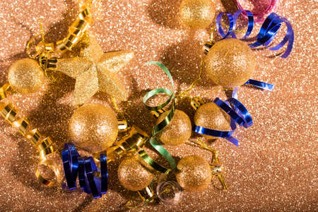 Festive content on a glittery background of gold color with serpentine, toys, sparkles. Flat lay