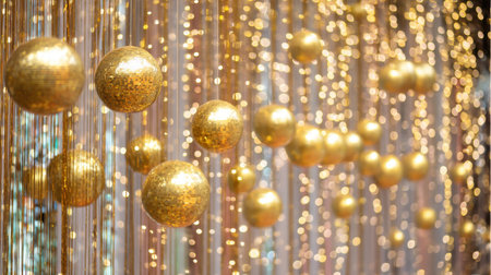Golden balls dangle gracefully against a background of shimmering strings, creating a vibrant and festive atmosphere perfect for celebrations and events.