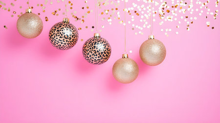 Gold glitter and leopard print Christmas ornaments hanging against a pink background with scattered confetti, creating a festive and glamorous holiday vibe.
