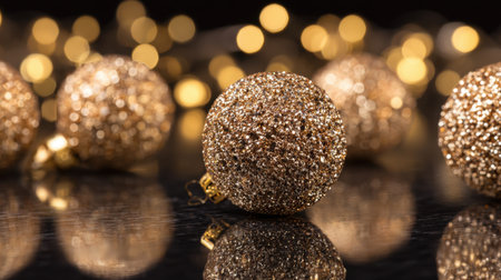 This stunning image showcases golden glittery Christmas ornaments surrounded by soft bokeh lights, ideal for evoking warm festive feelings and holiday spirit.