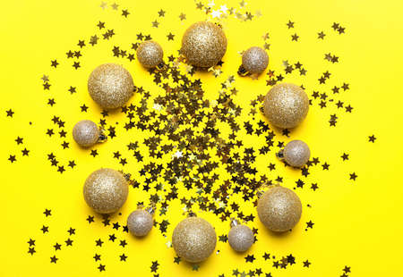 Composition with Christmas balls and confetti on yellow background