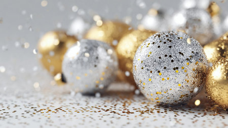 Festive Christmas baubles, shimmering in gold and silver confetti. 3d rendering Christmas greeting and winter season design. New year celebration background