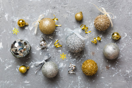 christmas composition. a pattern of christmas balls on colored background. Flat lay, top view New year decor.
