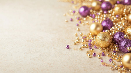 Christmas or Mardi Gras ornaments arranged on sparkling background with copy space, festive and decorative, AI generated