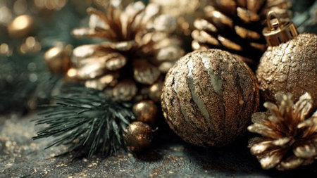 Golden christmas balls and pine cones on a dark background, closeup