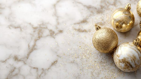 Various gold and silver Christmas ornaments are scattered across a glimmering gold surface. These decorations create a festive atmosphere in preparation for the holiday season.