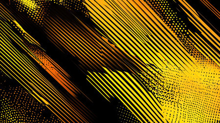 An abstract artwork features a dynamic composition of yellow and orange lines layered over a black backdrop. The design employs a textured effect, creating depth and visual interest through the varying arrangement of lines and gradients. This image could be suitable for digital art projects, website backgrounds, or various design applications.