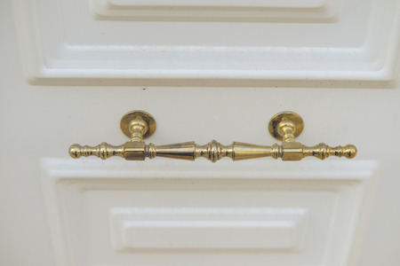 Closeup on brass handles with white doors background
