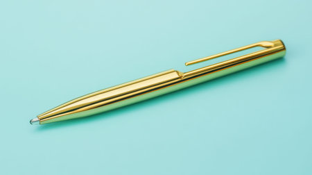 This captivating image features a sleek golden ballpoint pen elegantly positioned against a soft turquoise backdrop, ideal for showcasing writing tools.
