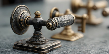 Vintage metal door handle with ornate detailing and aged texture placed on a stone surface with others in the background. High quality photo