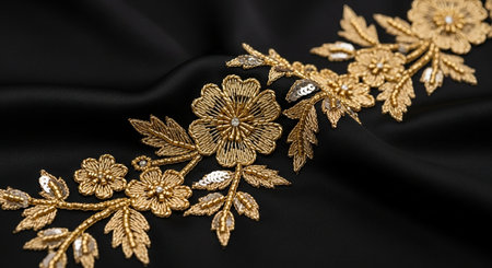 Elegant gold lace with pearls on black satin, a sophisticated and glamorous background.