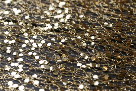 texture, background, pattern, black silk fabric with a pattern of gold sequins, the material allowing the light to pass through it so that the objects behind are clearly visible.