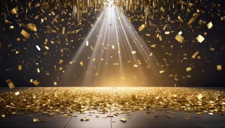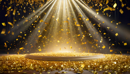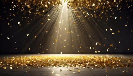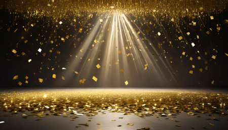 A dazzling golden confetti rain cascades under radiant light beams on a festive stage. The scene exudes celebratory energy, blending elegance and drama in a spacious, empty room at night,