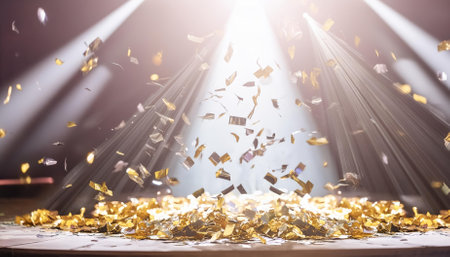 A festive stage covered in golden confetti with dramatic spotlights shining down. Curtains frame the background, creating a theatrical and celebratory atmosphere. Perfect for concepts like award shows, success, parties, or entertainment events.