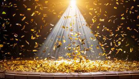 A breathtaking scene of golden confetti showering down onto a vibrant festive stage, beautifully illuminated by a central beam of light. This captivating display enhances the celebratory atmosphere, perfect for any event.