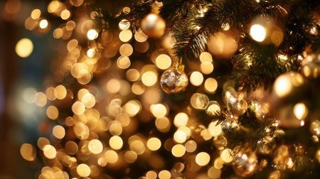 A captivating scene featuring soft bokeh lights and elegant gold ornaments on lush evergreen branches, perfect for evoking holiday cheer.
