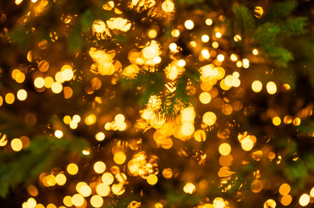 Soft glowing golden Christmas lights forming a bright festive bokeh on lush evergreen branches, creating a warm holiday atmosphere perfect for seasonal backgrounds