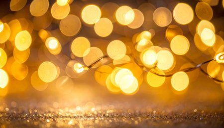 Warm golden bokeh lights and glittering sparkles create a festive and celebratory abstract background with a soft focus.