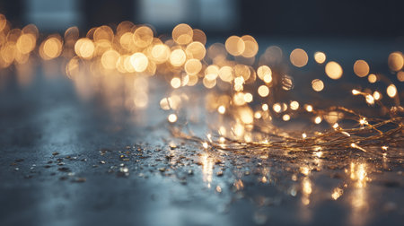 A mesmerizing scene of warm fairy lights reflecting on a smooth surface, creating a cozy and enchanting atmosphere, ideal for celebrations or intimate gatherings.
