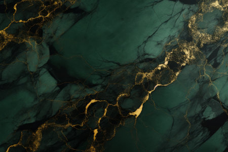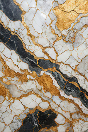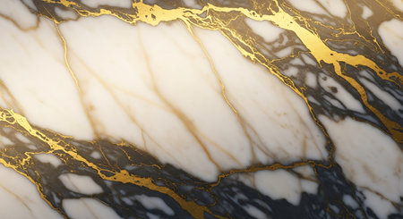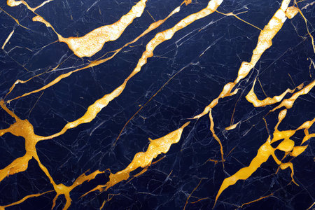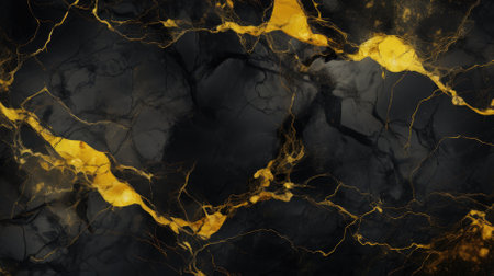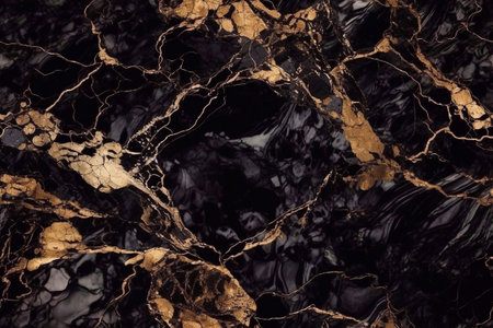 Close-up shot of a luxurious black marble with golden veins. The image showcases a refined and elegant texture.