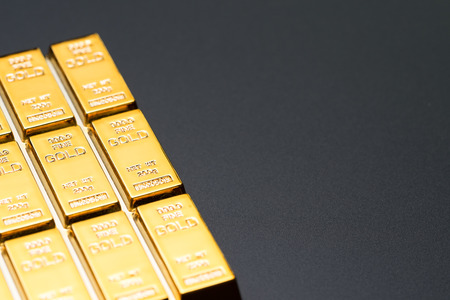 Gold bar bullions ingot on black background with copy space, crisis safe haven for investment or reserve for country economics.