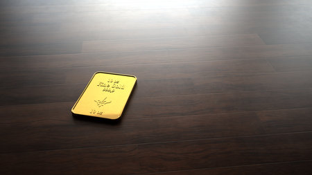 A stunning gold bar rests on a reflective surface, showcasing its luxurious shine against a textured background. The dramatic lighting highlights its elegance and value, ideal for finance and investment themes.