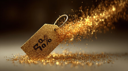Golden discount tag with 50 percent off written on it, surrounded by sparkling dust, generates a festive atmosphere suitable for advertising campaigns.