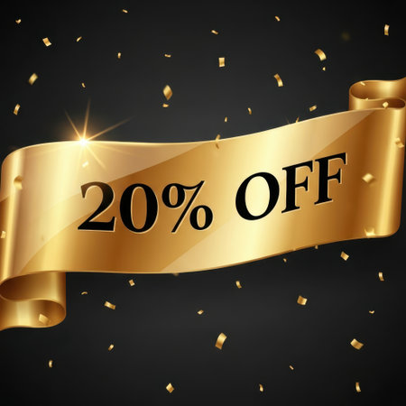 Celebrate savings with this eye-catching golden ribbon displaying '20% OFF'. The festive, sparkling background creates an atmosphere of excitement and special offers.