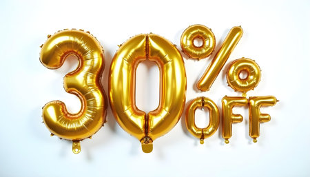 30 percent off discount golden balloon numbers and letters isolated on white background