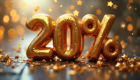 A vibrant golden 20 discount sign glimmers amidst a backdrop of shimmering stars and confetti. This festive image radiates excitement and celebration, perfect for promotions and special offers during holiday sales.