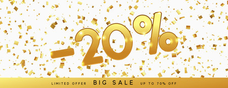 Discount voucher template design with gold confetti tinsel. Coupon card, sale banner template. 20% percent Vector illustration